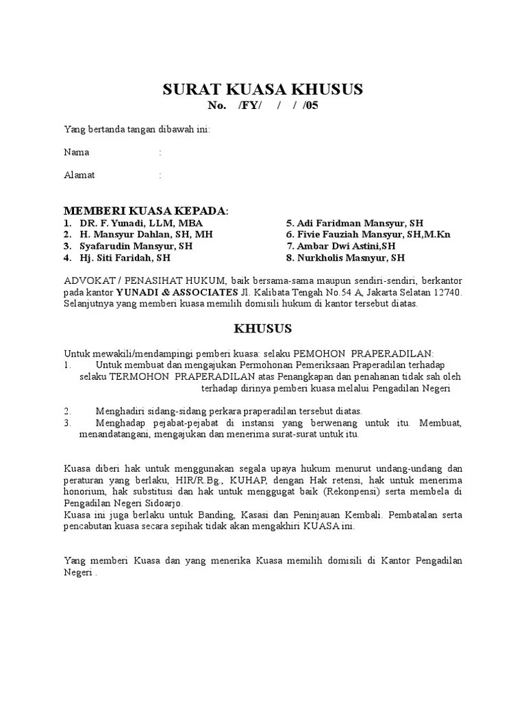 Biasanya surat kuasa untuk pengacara itu sendiri sih dibuatkan oleh pengacaranya langsung. Perbedaannya hanya terletak pada penjelasan lebih detail mengenai wewenang penerima kuasa (pengacara) untuk bertindak sebagaimana mestinya sesuai dengan proses pengadilan yang sedang berlangsung. Istimewa ini merupakan surat kuasa khusus yang berhubungan erat dengan hukum. Yang bertanda tangan di bawah ini : Konsultan hukum and attorney at law pada aufa & partners, yang berkedudukan di jalan singosari no 18 kel.