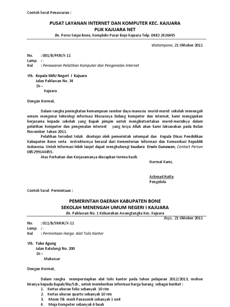 Dalam peraturan tentang pengadaan barang/jasa pemerintah menetapkan bahwa yang berhak menandatangani surat penawaran adalah: Untuk lebih jelasnya, anda bisa menggunakan contoh surat penawaran komputer di bawah ini. 73 blok f sulawesi selatan. 50a bandung dengan hormat, sesuai dengan surat permintaan penawaran barang bapak/ ibu dengan nomor 032/pb/321/8/2016 berupa seperangkat komputer yang telah kami terima pada tanggal 2 november. Dalam dunia bisnis, penawaran akan selalu ada antara pihak satu dengan pihak lainnya.