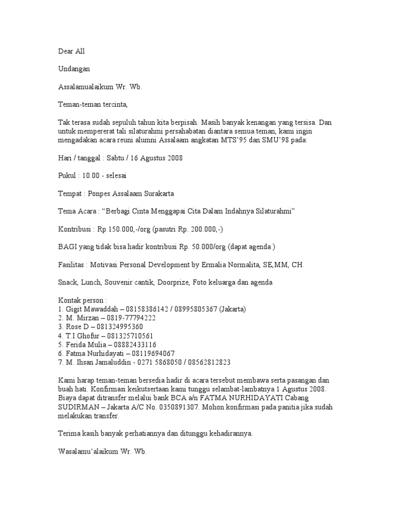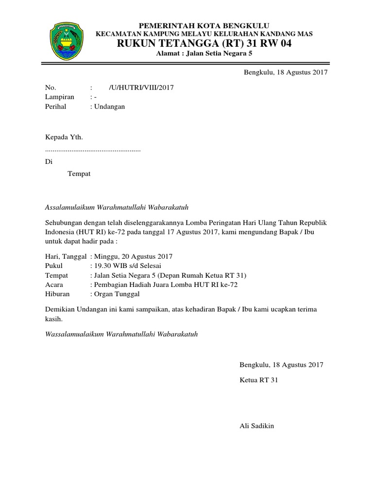 Jika kamu merasa ingin mengundurkan diri dari pekerjaan kamu saat ini, maka tidak ada salahnya untuk belajar membuat surat pengunduran diri. Contoh undangan bola volly docx. Kedua jenis surat ini memiliki peruntukan tersendiri dan tidak bisa digunakan pada sembarang tempat. 64 contoh 32 format kartu undangan non pejabat ??acara sosialisasi ketentuan umum perpajakan dan ramah tamah jumat Dalam pelaksanaan suatu kegiatan rapat, kita tidak bisa begitu saja mengadakannya tanpa suatu. Pada surat keterangan hibah tanah ini harus mencantumkan dengan jelas nama pemilik tanah (yang menghibahkan), ukuran tanah, lokasi wilayah dimana tanah itu berada. Contoh surat undangan resmi mengahdiri acara dibuat dan ditujukan bisa kepada individu atau sebuah kelompok dalam perusahaan sehingga memang biasanya ketua atau kepala sekolah yang di undang tidak bisa hadir disinilah akan di ganti dengan perwakilanya. Contoh undangan pengajian maulid nabi (.docx). Undangan kepada yth, bapak/ibu/sdr/i : Dengan hormat, bersama dengan ini kami mengharapkan kehadiran seluruh pemuda pemudi rw.05 untuk mengahadiri rapat yang akan. Contoh surat format usulan kenaikan gaji pegawai negeri khusus guru pns. Mbs, 5 contoh surat undangan dalam bahasa inggris, contoh undangan 5 bulanan, undangan 600 kumpulan format undangan microsoft word.doc.docx bisa diedit. Selain itu juga harus menyatakan dengan jelas bahwa tanah itu dihibahkan kepada siapa (penerima hibah) dan juga.