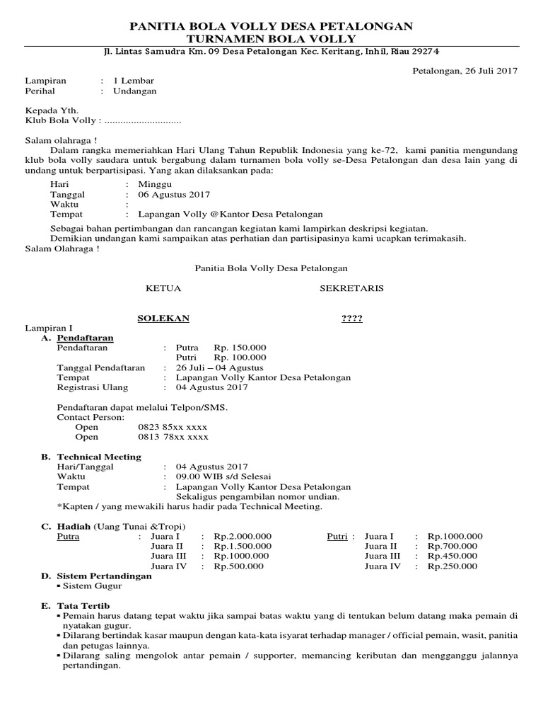 Contoh undangan bola volly docx. Download kumpulan undangan dalam format microsoft word doc. Jika anda bekerja di bagian administrasi kegiatan surat menyurat adalah hal yang biasa, dan membutuhkan sedikit karena itulah, kami memberikan beberapa contoh format undangan resmi yang bisa digunakan untuk beberapa acara, misalkan pengajian, rapat. Download & view contoh surat undangan karang taruna.docx as pdf for free. Untuk mendapatkan file contoh surat undangan rapat perusahaan yang tidak diproteksi dan bebas untuk diedit, silahkan anda kunjungi situs kami.