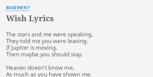 6 years ago6 years ago. The stars and me were speaking, they told me you were leaving. If jupiter is moving, then maybe you should stay. Listen to music online or download for free in mp3, on your computer or phone. Wish by basement from the full length record colourmeinkindnessbuy colourmeinkindness on itunes. Report this track or account. Wish by basement from the full length record colourmeinkindness. 3,317 views, added to favorites 63 times.